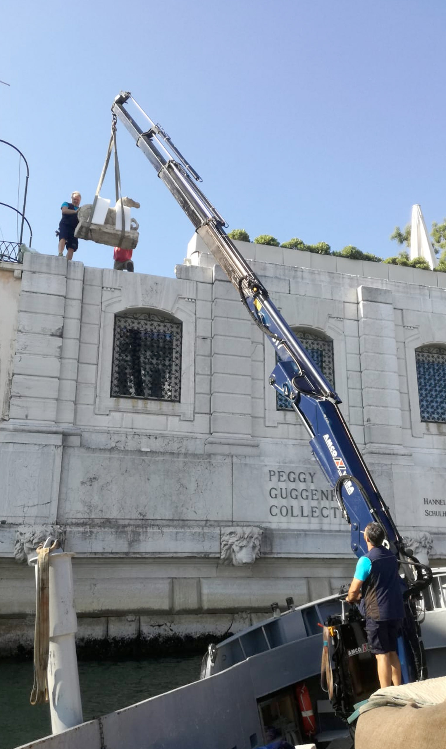 Le imbarcazioni di cui disponiamo sono dotate di gru con sbraccio in grado di sollevare - mediante appositi accorgimenti con fasce idonee - sculture/casse/opere.
